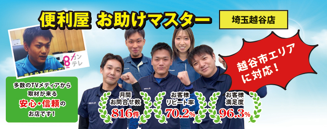 この度は便利屋お助けマスター埼玉越谷店にご来店いただきまして誠にありがとうございます。当社では「格安」を売りにしているわけでは無く、決して大手の便利屋さんでもありません。しかし、そんな中当社をお選びいただけたお客様には必ず「選んでよかった」 と言っていただけるサービスのご提供をお約束いたします。