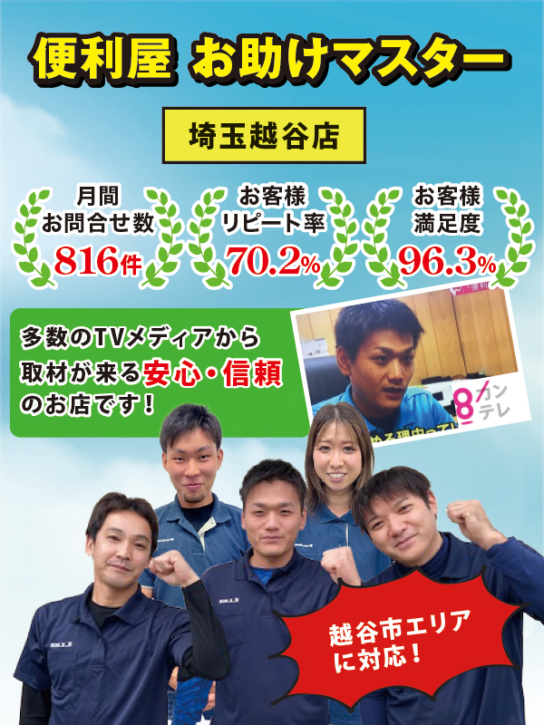 この度は便利屋お助けマスター埼玉越谷店にご来店いただきまして誠にありがとうございます。当社では「格安」を売りにしているわけでは無く、決して大手の便利屋さんでもありません。しかし、そんな中当社をお選びいただけたお客様には必ず「選んでよかった」 と言っていただけるサービスのご提供をお約束いたします。
